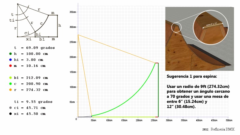 ResponderBorrarHola, perdón por tardar en responder. Sí, 60° es una de las medidas más comunes y que funcionan muy bien. Con 120 cm de altura y 60° de inclinación el radio sería de 240cm. El ancho mínimo suele ser 2.44m por estar relacionado con la medida de las hojas de madera; 3.66m sería un poco mejor. Dependiendo de qué trucos te gustaría practicar más puedes ajustar detalles. Ejemplo: Si te gustan los ice-picks, double-pegs, smith-grinds, etc. yo bajaría el radio a unos 2.1m quizá para obtener un ángulo un poco mayor (cercano a 65°) que permita colocar los pegs con más comodidad. Por otro lado, si te gustaría practicar alley-oops o trucos de aire, preferiría el ángulo de 60° para que el radio sea lo más amplio posible. Esa medida también funcionaría bien en trucos como abubacas, taps a drop-ins, foot-jams a fakie o cualquier otro que no utilice los pegs.